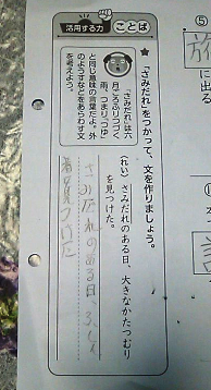 画像はある日持ち帰った国語プリントの裏面。最近脱ゆとりでお勉強全般が難しくなり、このようにオマケ問題が増えました。この日は 『さみだれ』 を使って文を作りましょう。12月頃やらせるプリントでさみだれはないだろう…と思いながら学校へ提出する前のチェックをしていたらっ。